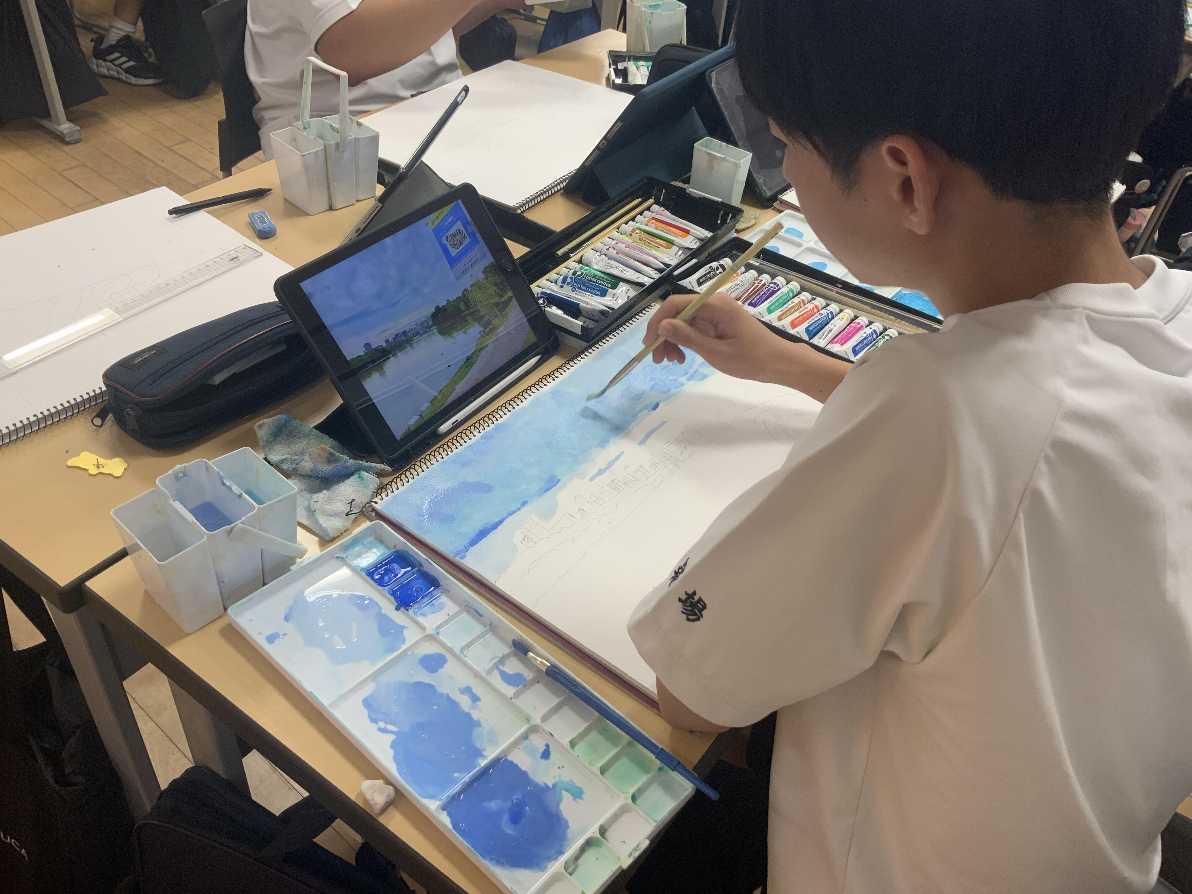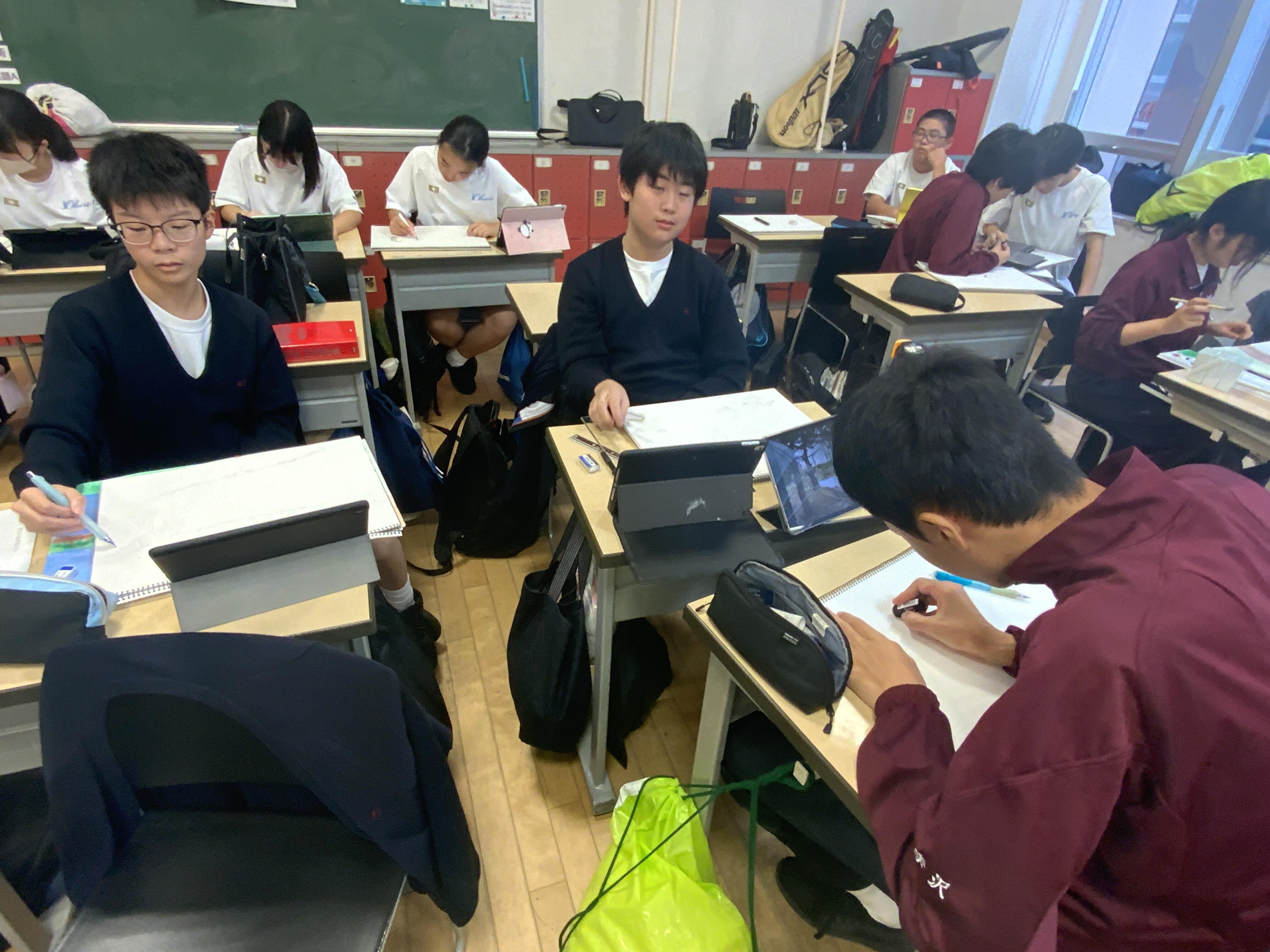 10月31日(木)に中学1・2年生のスケッチ大会が行われました。例年は大濠公園にて行われますが、当日はあいにくの雨。生徒たちは1時間目に大濠公園のお気に入りスポットを写真に収め、それ以降は教室にてスケッチしていくことになりました。美術の村上先生から近景・中景・遠景を意識するよう伝えられた生徒たちは工夫して写真を撮っていました。