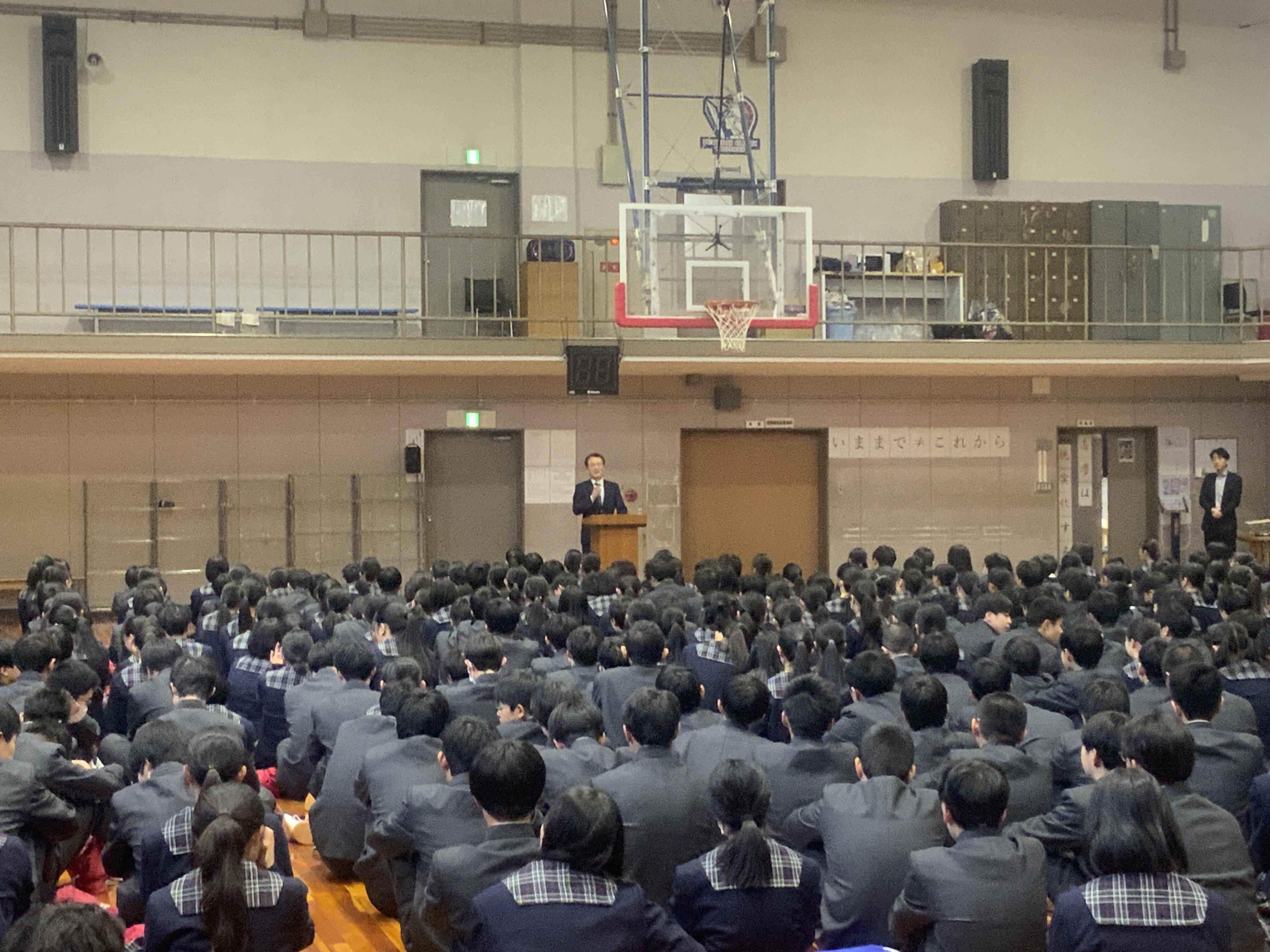 田中校長の式辞では、生徒達には心の余裕を持って3学期を迎えて欲しいとお話しいただきました。もし、失敗しても、実力が十分に発揮できないとしても、心の余裕があれば前向きに考えることができると仰っていました。また、自分自身を思いやることで初めて他者を思いやることができるとお話しされ、一日一日丁寧に積み重ねることが大切だと生徒たちを激励されました。