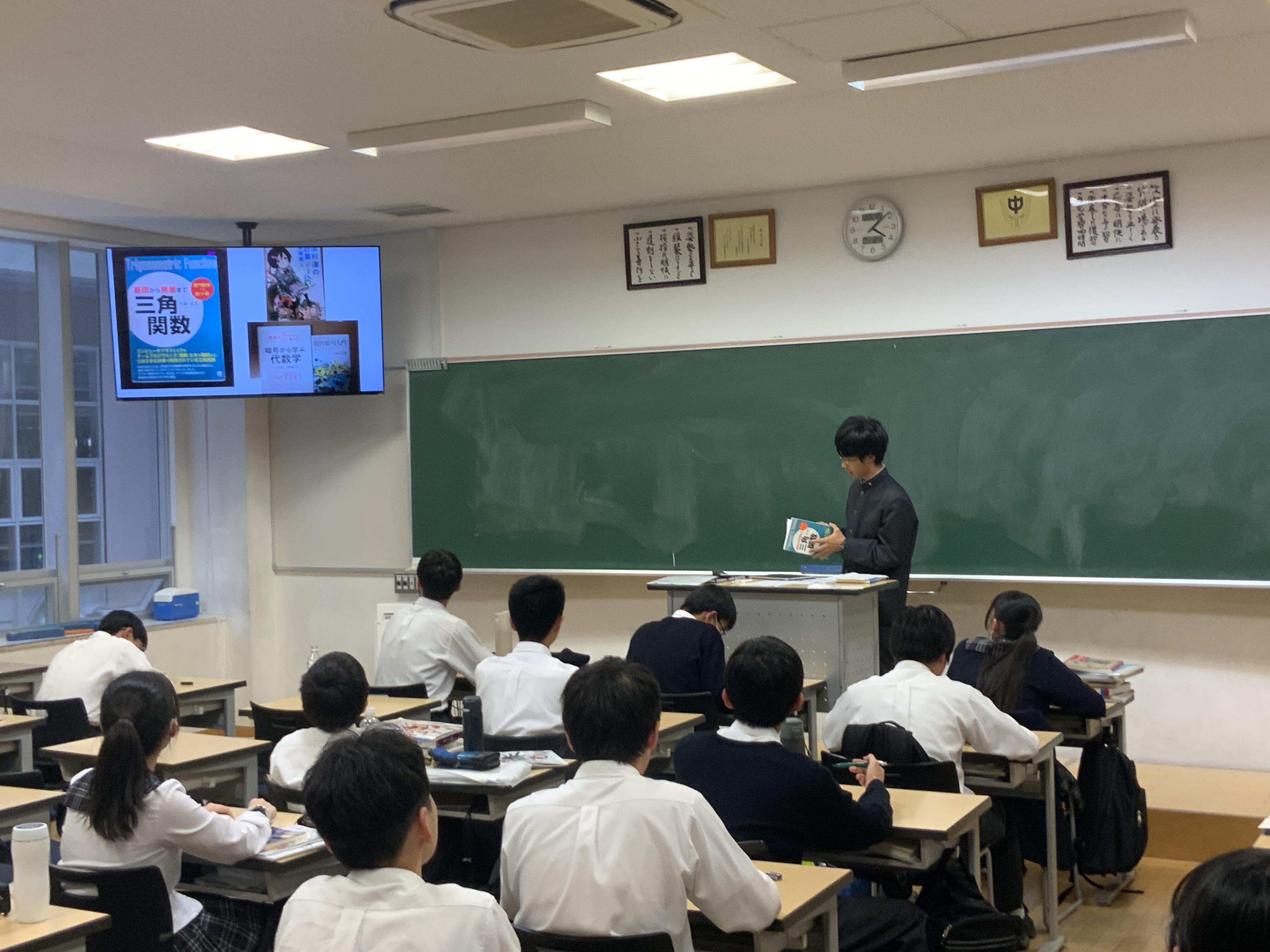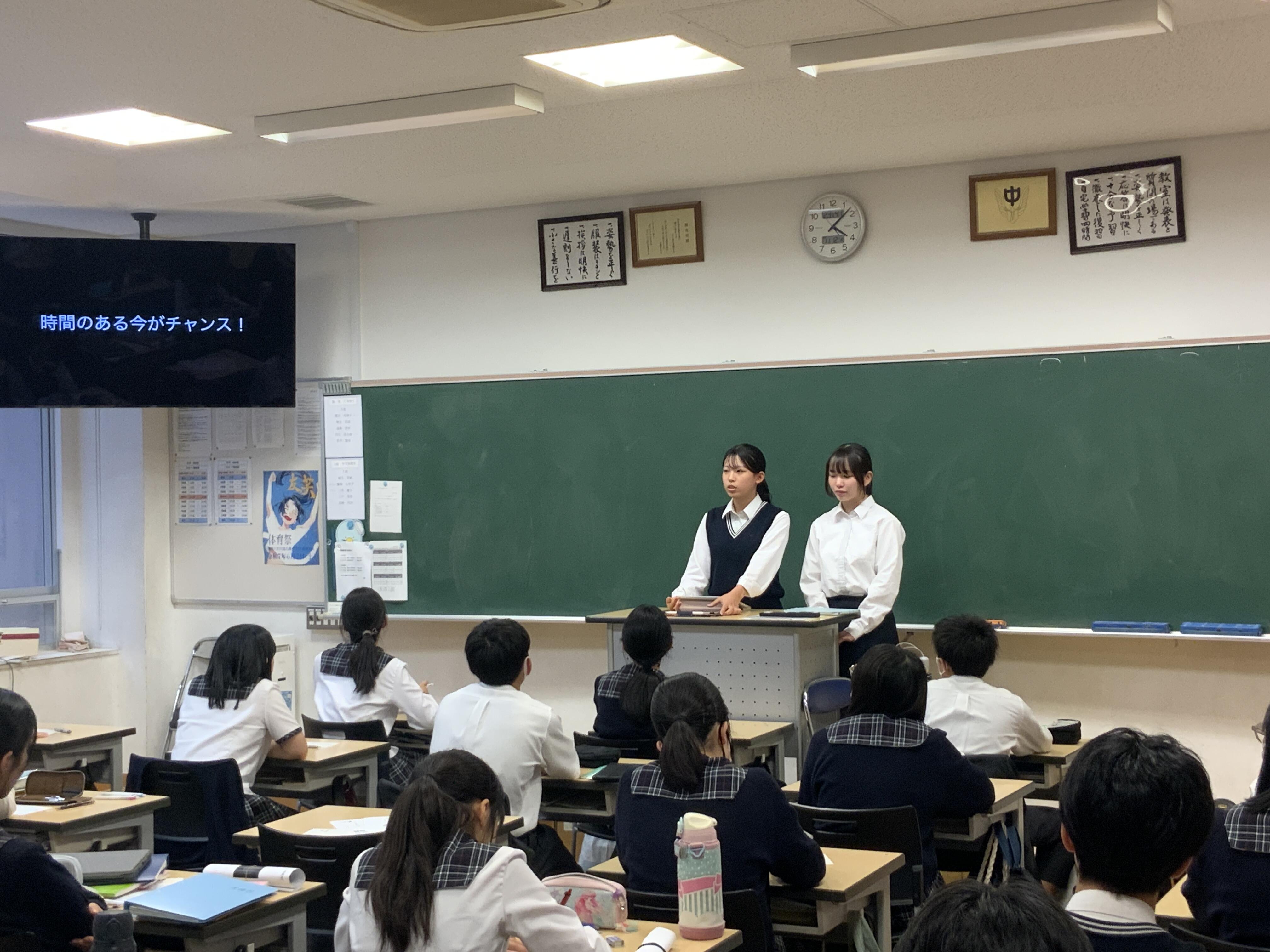 11月12日(水)の帰りのHRの時間を使って、第二回ホームカミングデイ・ミニが行われました。この企画は、毎回大濠高校の中高一貫コースの先輩が中学生に向けて自身の中学時代の経験や高校生活に向けての心構えなどを話すものです。