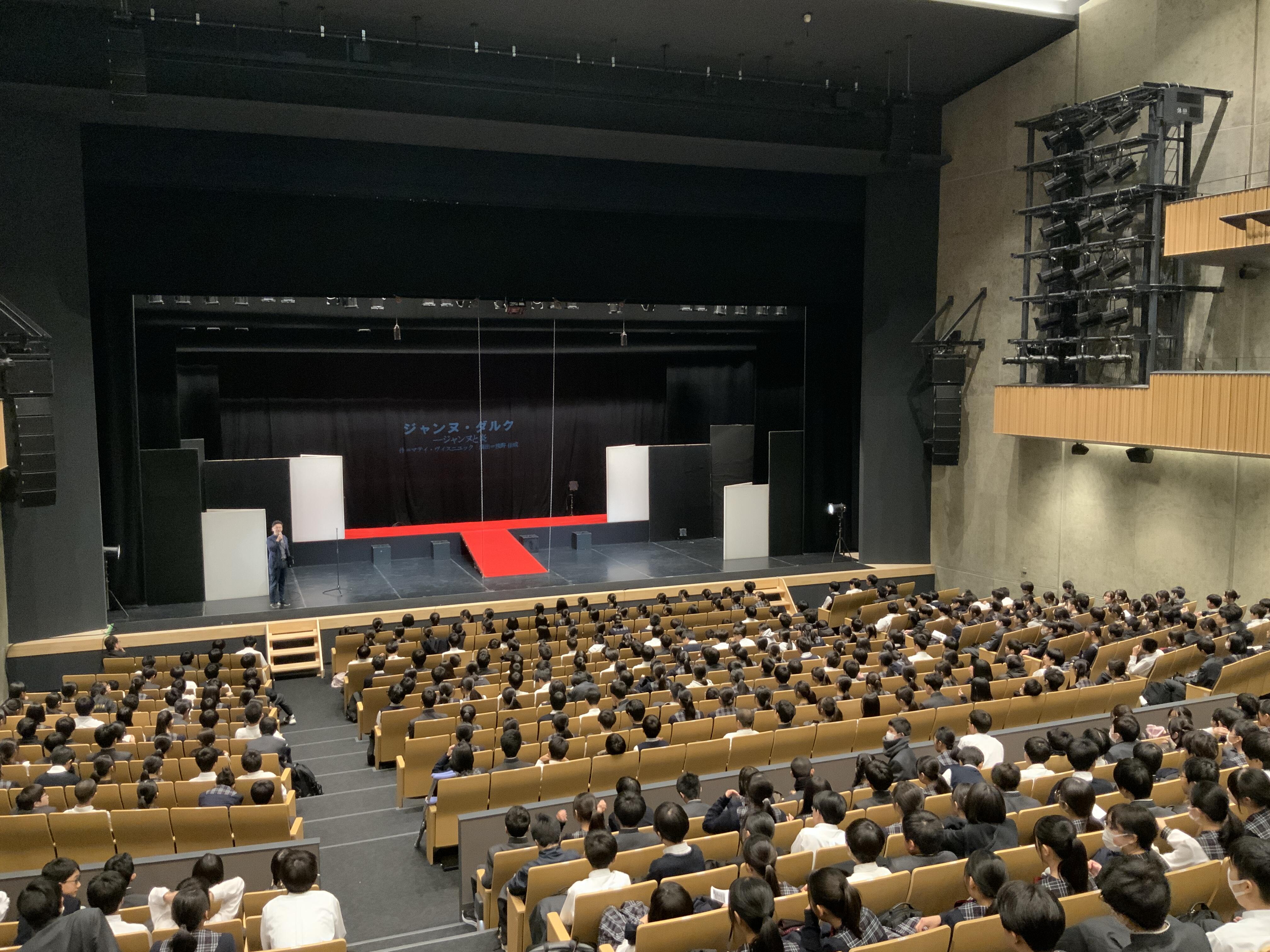 その後の懇談会では、生徒たちの質問に丁寧に心を込めて答えて下さいました。ジャンヌは神の声、内なる声に導かれた存在でした。また、役者のみなさんの体にまっすぐ響いてくる声に感動する舞台でした。主演の髙階さんは声について「高さや空気量を自分との対話で決める」とおっしゃっていました。また、生の演劇だからこそ、見ているお客さんによって引き出される感情があり、そこにおもしろさがあるともおっしゃっていました。ジャンヌを導いた神の声、自分の体から湧き上がる声、舞台上の他の役者さんと響き合う声、舞台を見つめるお客さんの内なる声など、この舞台は「声」が象徴的であったように思います。
