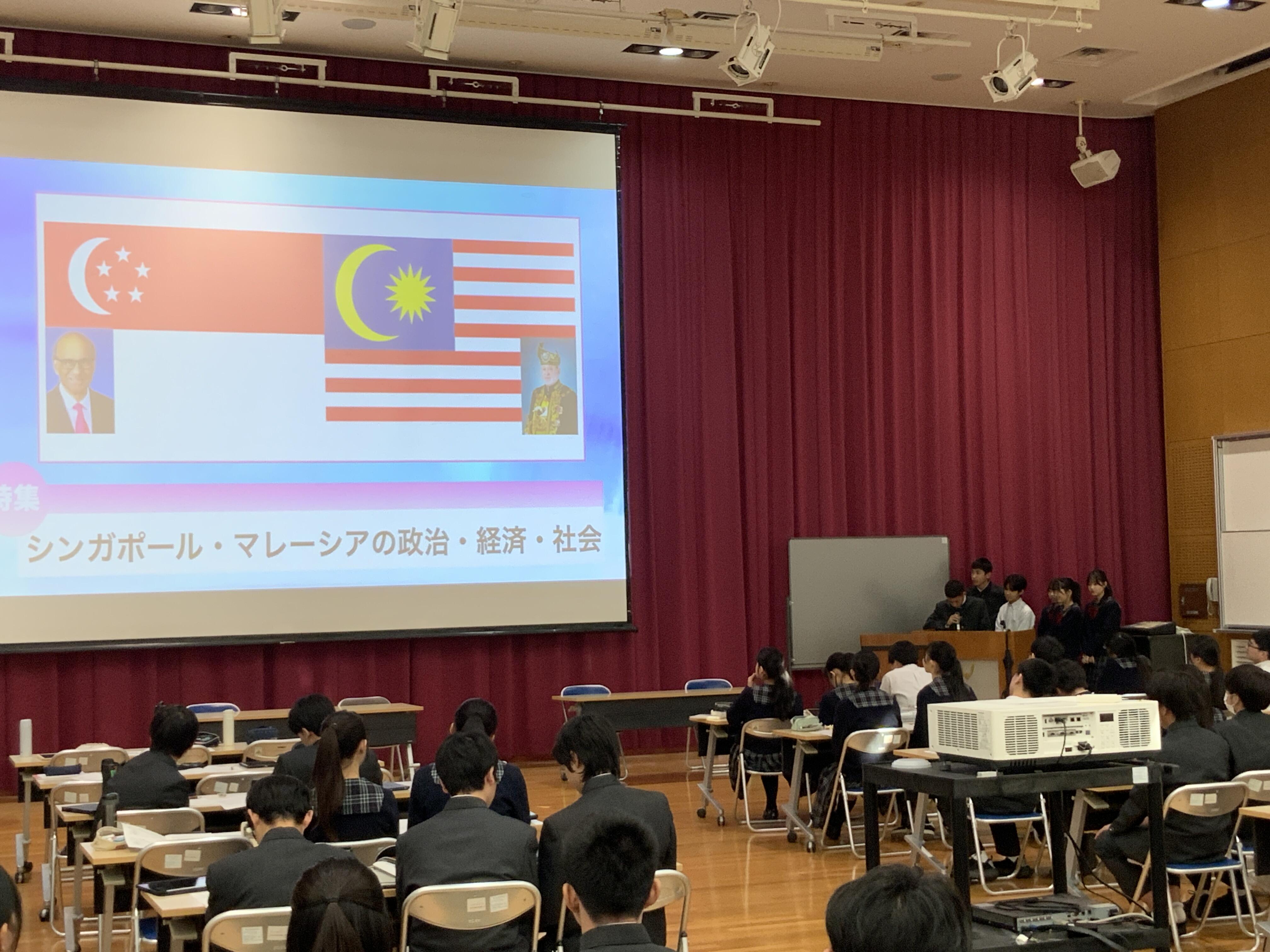 中学3年生は、本校 6階 視聴覚室でシンガポール・マレーシア修学旅行の学年報告会を行いました。生徒たちは、修学旅行前に調べておいた事前知識を基に、実際にシンガポール・マレーシアを訪れ学んだこと、感じたことについて資料をつくり発表しました。学年報告会では、7つのテーマについてそれぞれ2グループずつの代表班が発表しました。事前学習報告会で立てた仮説や疑問を修学旅行を通して立証、解決できた様子でした。笑いを交えて発表する班や、考えや思いを感情に乗せて発表する班もあり、今までの総合学習で練習してきたプレゼン力が発揮されたよい発表会になりました。![]()