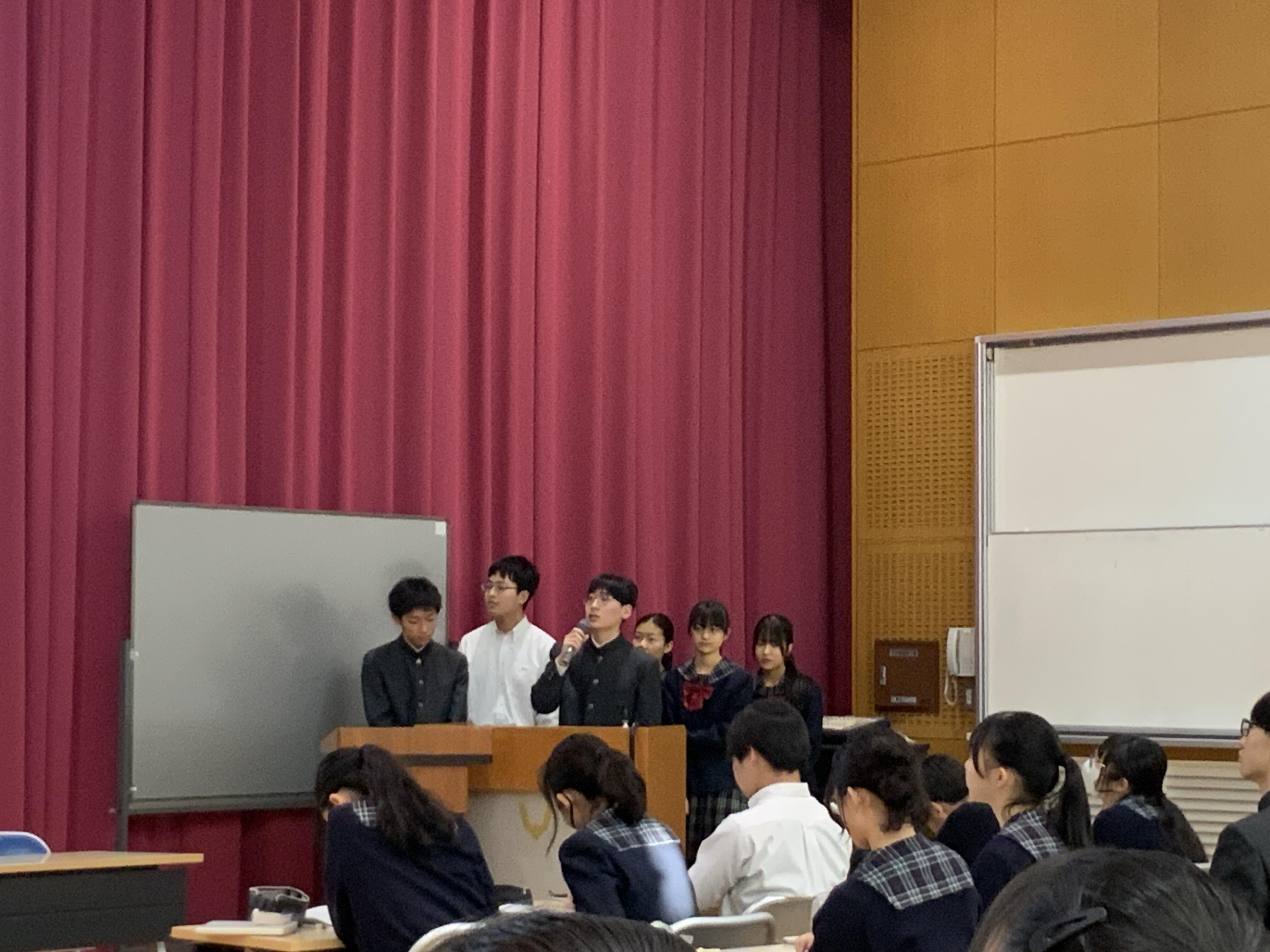 中学1年生は、日本製鉄、シャボン玉石けん、EVモーターズ、JICA九州、UBE三菱セメント株式会社、ゼンリンミュージアムの6つの企業について、総合的な学習の時間で調べたり、実際に10月に見学に行ったりしてまとめてきました。その内容について、各班のメンバーが4つの教室に分かれ、各班の代表として発表しました。緊張しながらも調べたことについて堂々と発表し、また、聞き手としても良い雰囲気で発表を聞くことができました。![]()